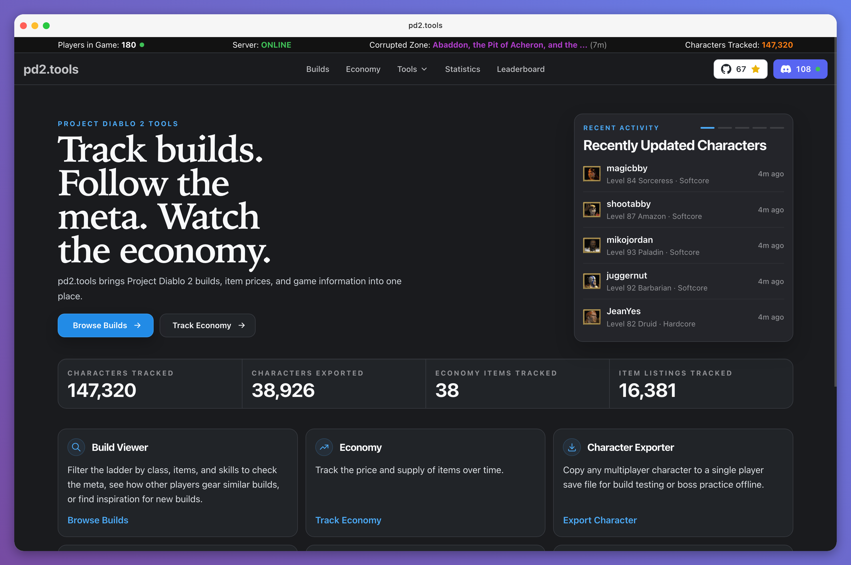 pd2.tools is an open source Project Diablo 2 toolkit for exploring builds, tracking the economy, browsing game data, and more.