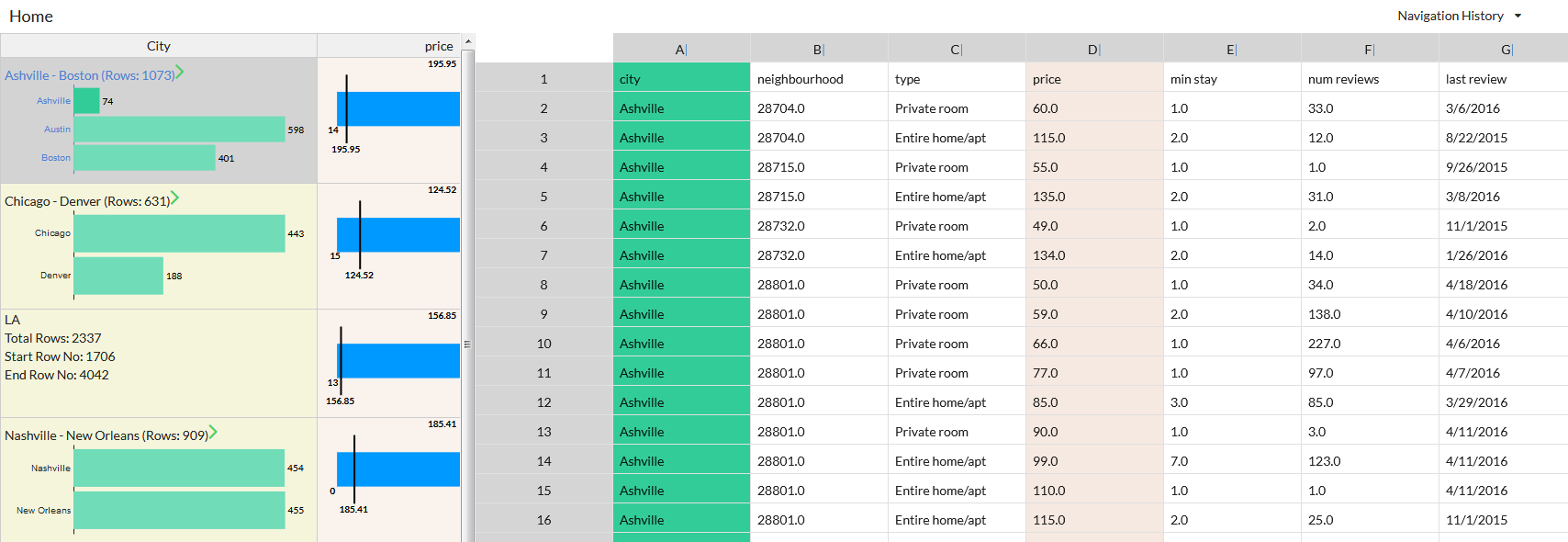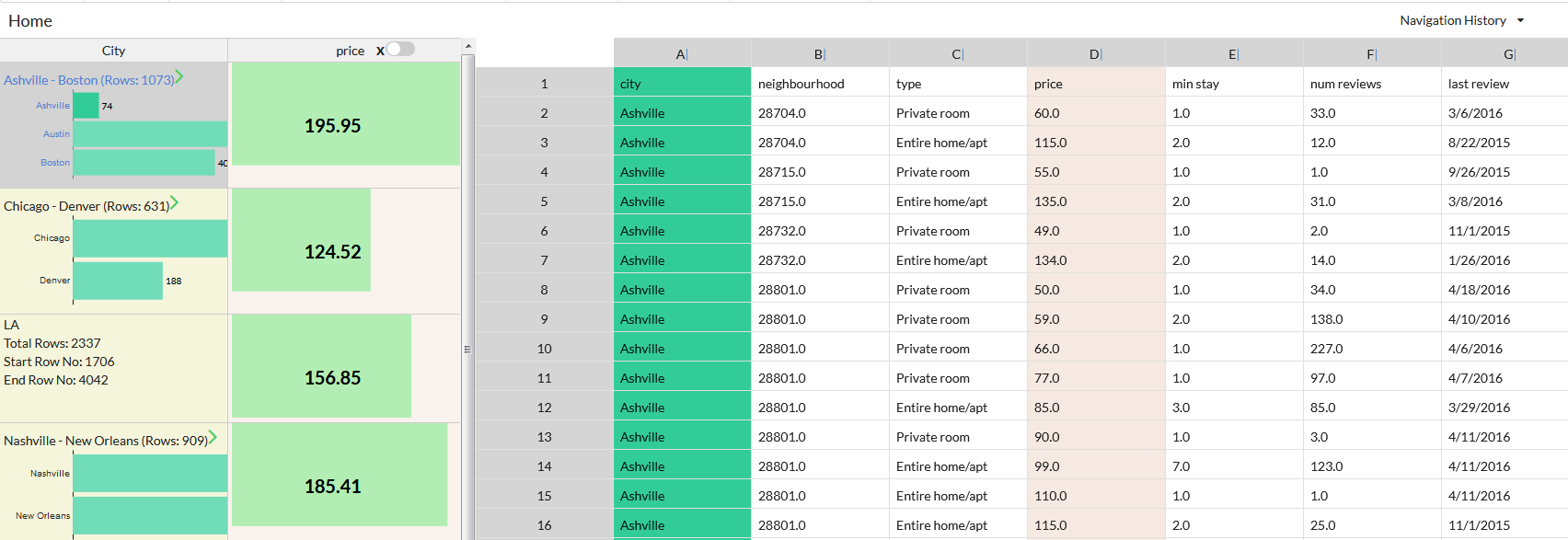Users can choose to view the result of formulae either as raw values or charts and can toggle between the two. Raw values are displayed along with a colored bar called value bar whose length is proportional to the corresponding aggregate; users can use the lengths to visually compare across bins. The chart representation varies depending on the formula type.