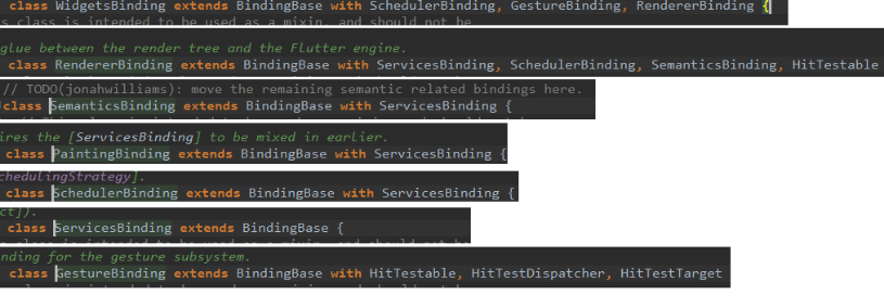 从上图我们可以看出, WidgetsFlutterBinding 本身是并没有什么代码,主要是继承了 BindingBase,而后通过 with 黏上去的各类 Binding,这些 Binding 也都继承了 BindingBase。