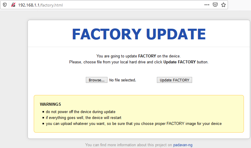 - Go to 192.168.1.1 from any browser and upload or upgrade your firmware. You can also upgrade your factory and u-boot partition from 192.168.1.1/factory.html and 192.168.1.1/uboot.html respectively.
