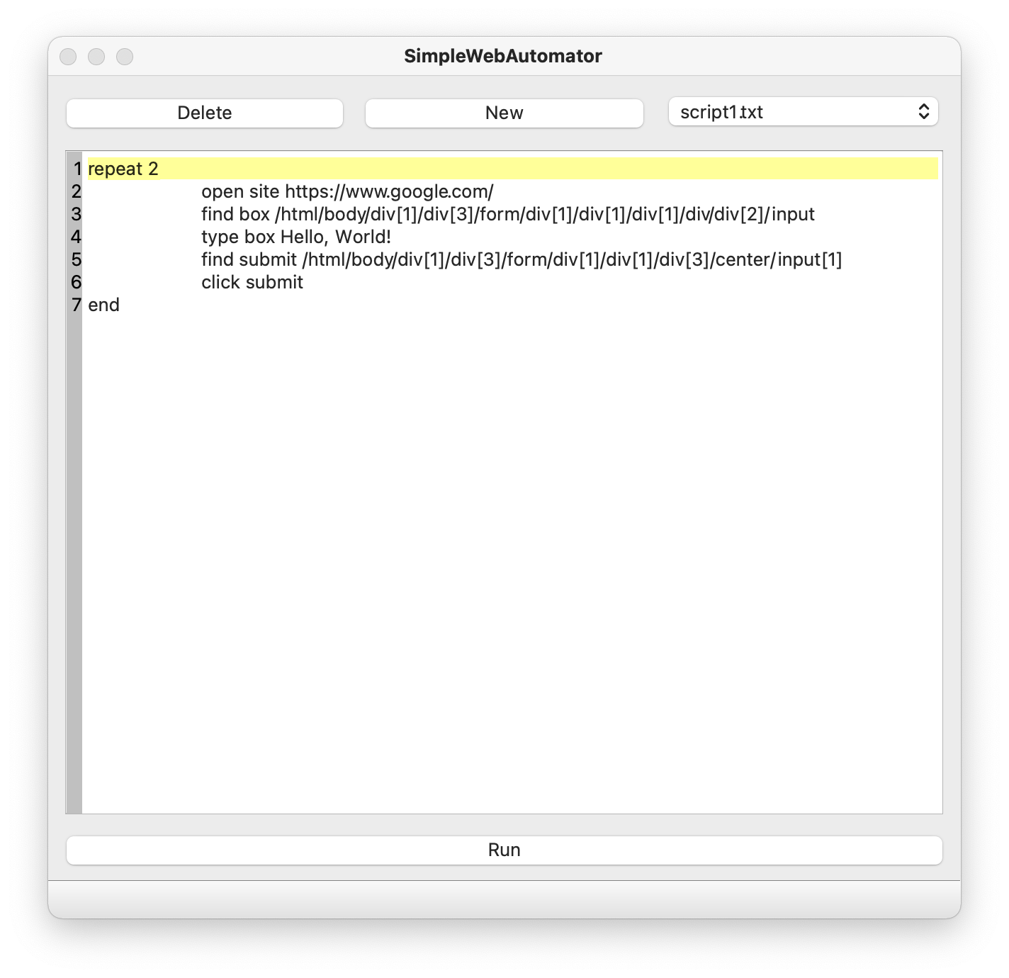 SimpleWebAutomator Create web automation scripts with no programming knowledge. Converts txt documents with basic syntax to selenium scripts. Currently Supported Commands Open (website url) find (what you want to name element) (Full Xpath) click (element name) type (element name) (text you wish to type) wait seconds (seconds) repeat (number of times to repeat) *must be closed with end. end Examples Example script can be found in scripts/example.txt Example output script can be found in selenium_scripts/example.py Images