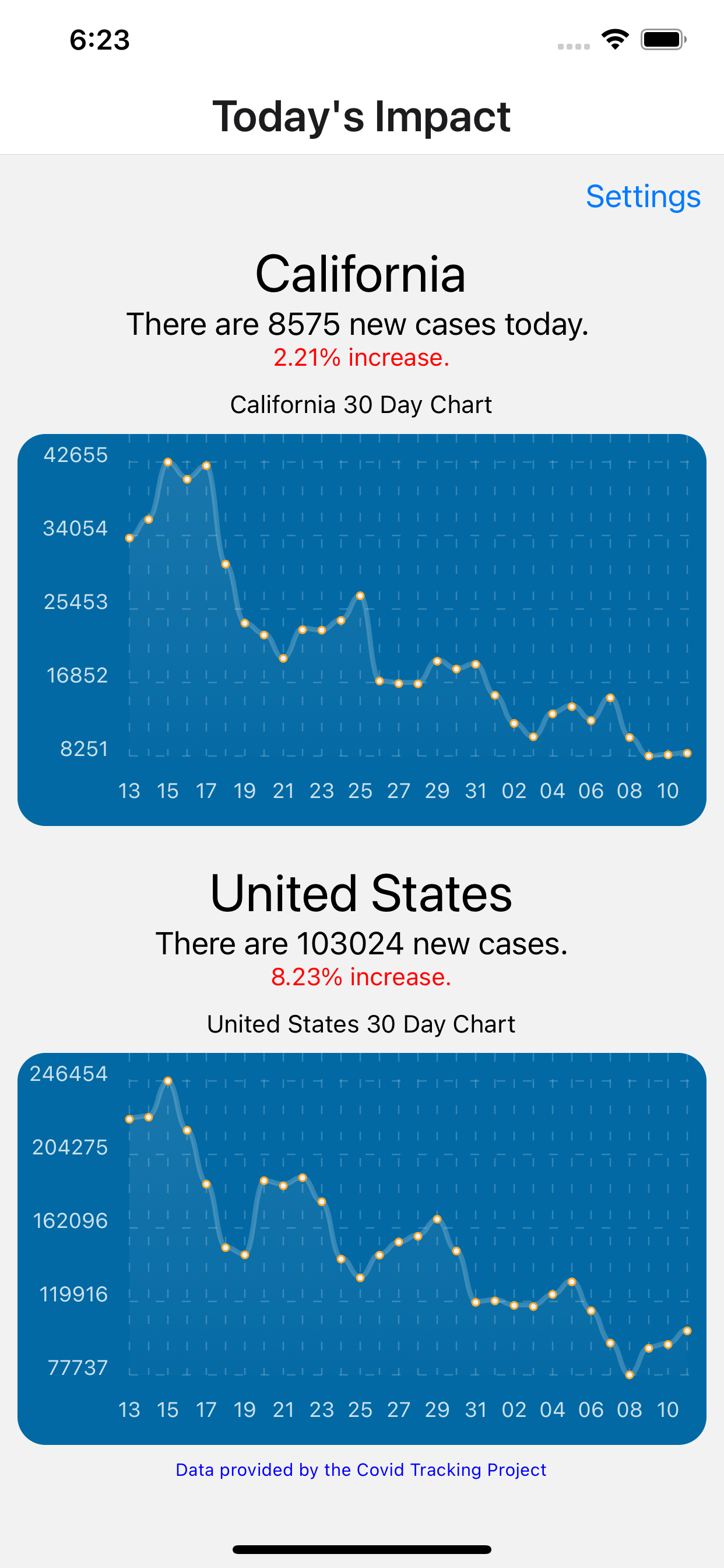 covid-tracker A mobile application which tracks Covid-19 cases on a state and nation wide basis. Video Demonstration Link