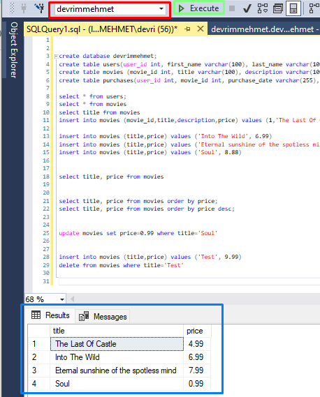select title, price from moviesselect title, price from movies order by price; select title, price from movies order by price desc;update movies set price=0.99 where title='Soul'