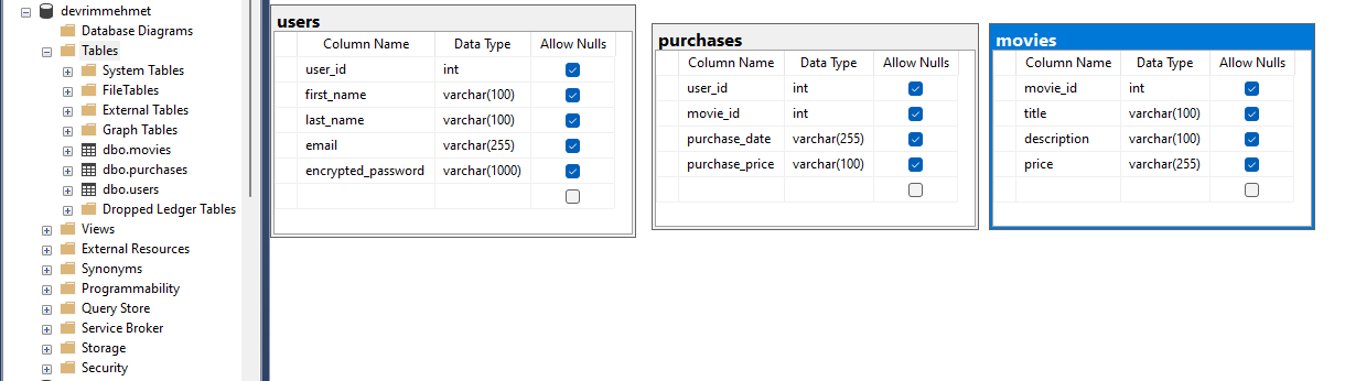 create table movies (movie_id int, title varchar(100), description varchar(100), price varchar(255));