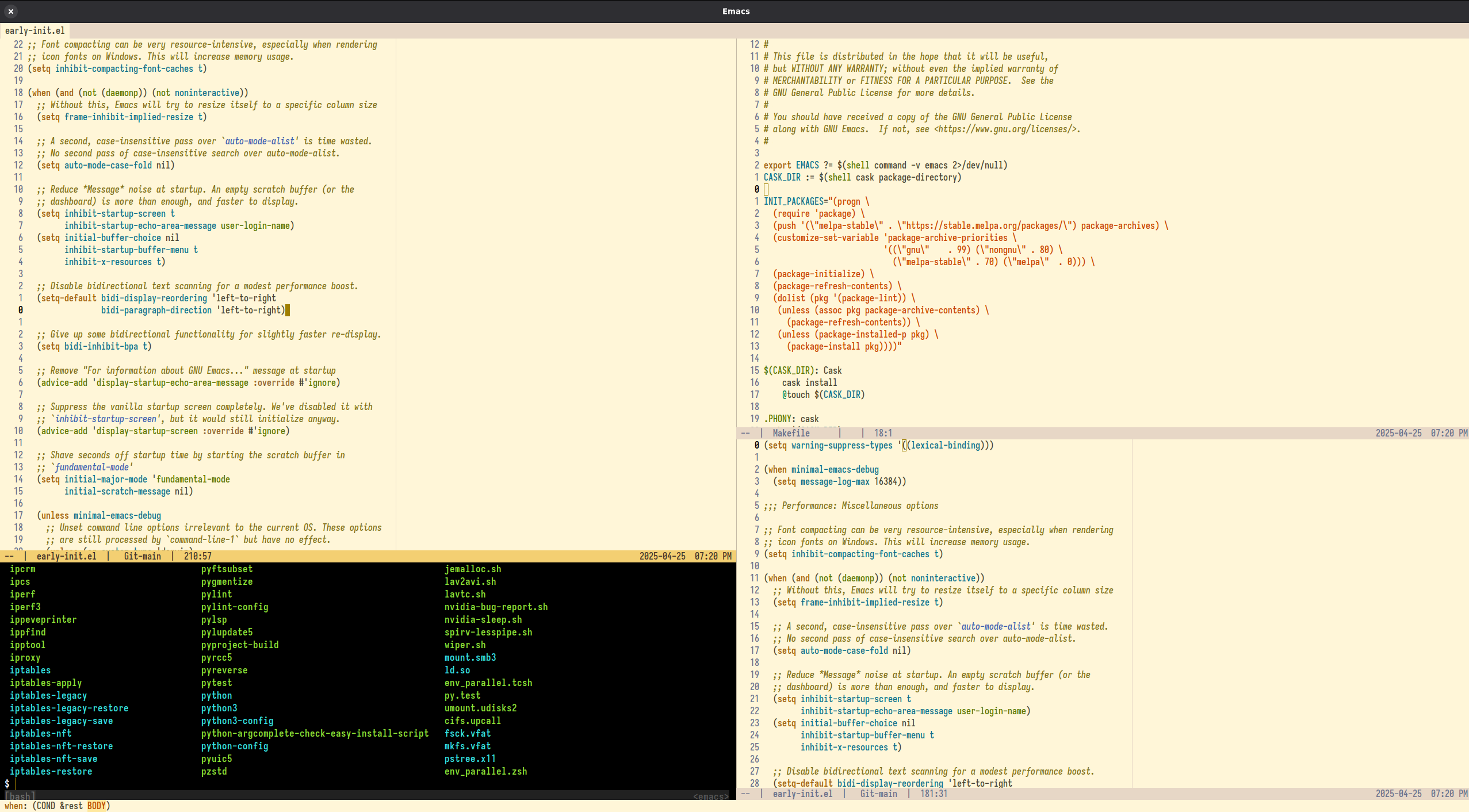 - Configures Emacs to avoid resizing frames and minimizes unnecessary UI updates.