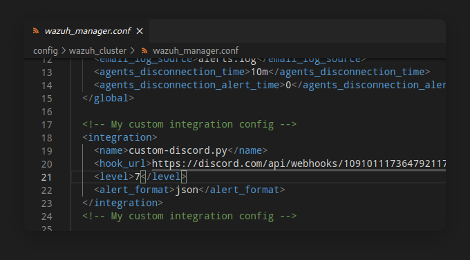 After that, we can edit the file /config/wazuh_cluster/wazuh_manager.conf as follows.