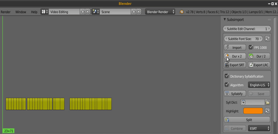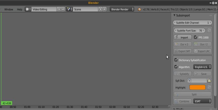 Subs import is an addon for Blender that allows users to create and edit subtitles for movies or music. The keyboard shortcuts and automatic syllable separation tools make it a very fast tool.