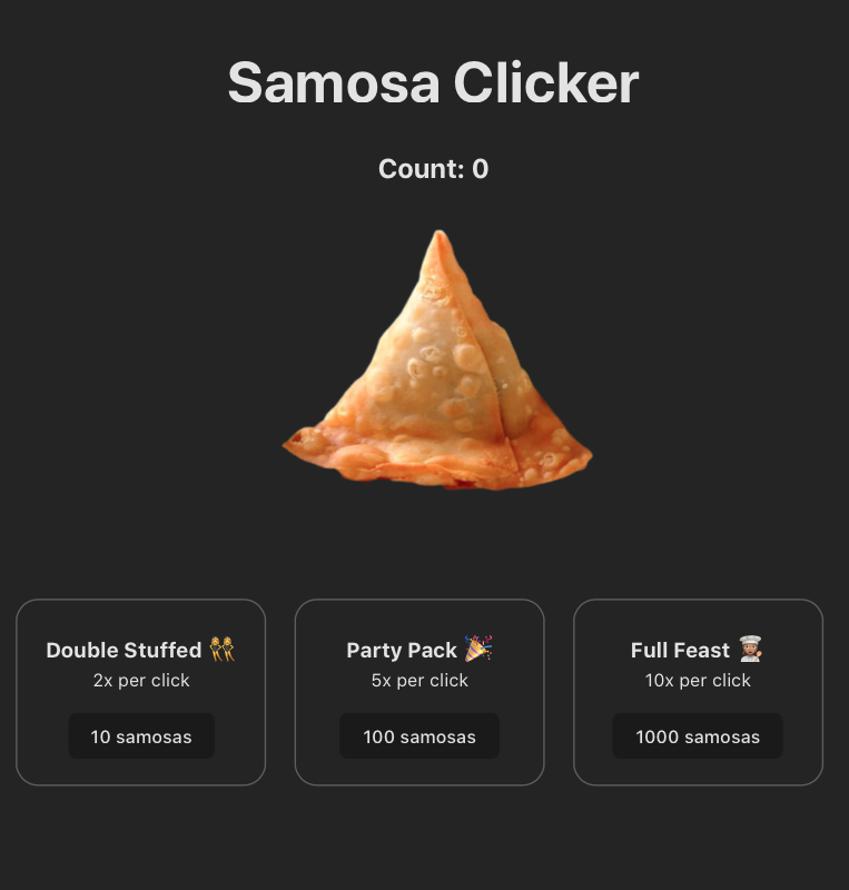 SamosaClicker Description The goal of the game is to produce as many samosas by clicking on the big samosa. Technologies React & Vite Screenshot
