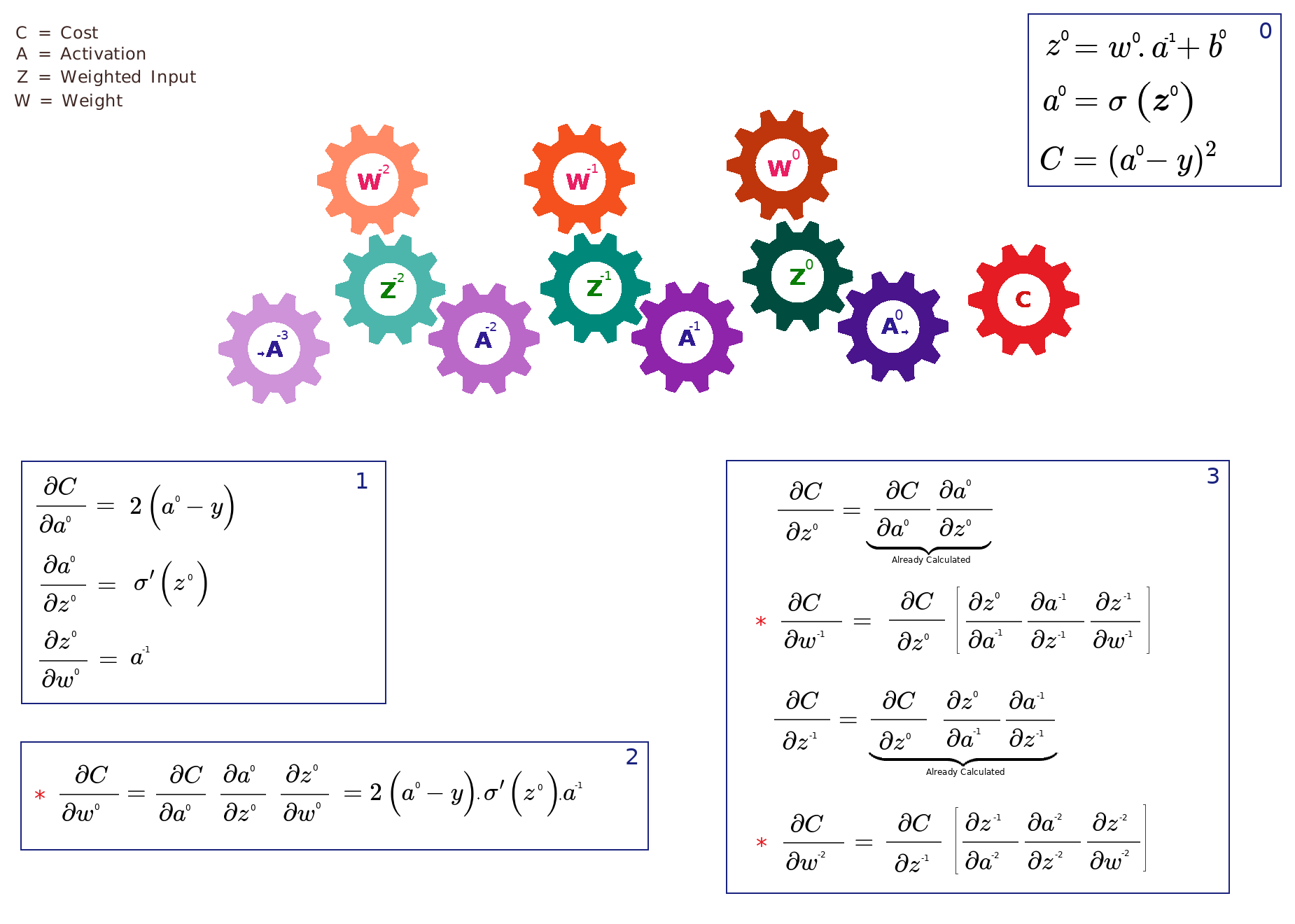 Here is how it's work. We start from the final gear (cost) and ask ourselves which gear directly affects it? As you can tell from the image, the answer is A0, so we take derivative ∂C/∂a0 and note it somewhere. Remember that the derivative only tells how much A0 affects C. Next we ask which gear directly affects A0 and it's Z0. We calculate ∂a0/∂z0. Next we ask which gear directly affects Z0, there are actually two, W0 and A-1. Let's continue with W0 first and calculate ∂z0/∂w0.