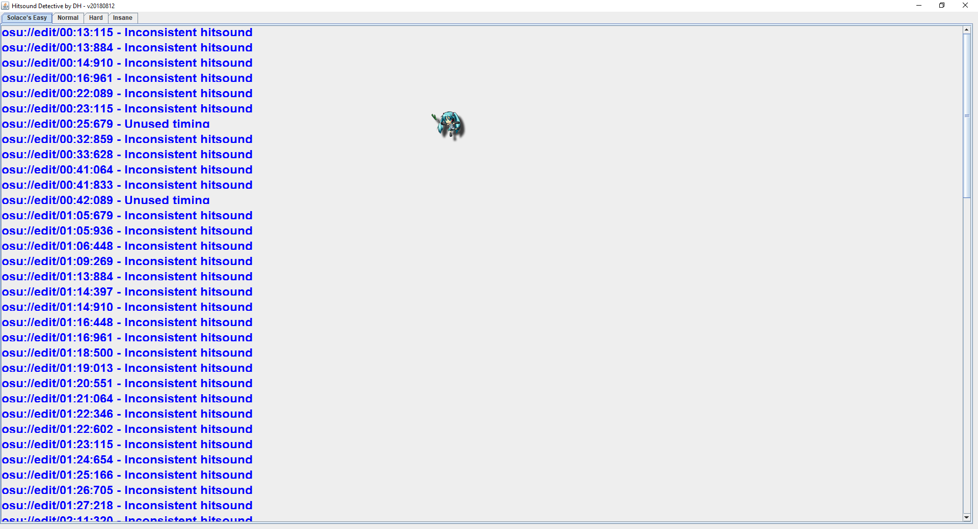 Support addition (addition overrides sampleset) Can detect missing hitsound (if you used "soft-hitfinish.wav" but you dont have it in your song folder) can detect muted hitsound or SB sample (SB sample has 0 volume, or hitsound is "xxx.wav" with 0 volume) it does not consider hitnormal as a hitsound, ignored in check for inconsistency.