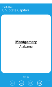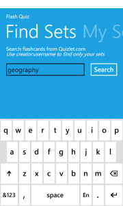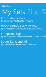 Search for flashcard sets on Quizlet.com and select from thousands of subjects. Or create your own sets on Quizlet and then take them with you with FlashQuiz. You can add flashcard sets to your own personal “My Sets” list for quick retrieval without having to search again. The new version brings a more attractive interface and uses Windows Phone’s unique Pivot view to switch between My Sets and Find Sets.