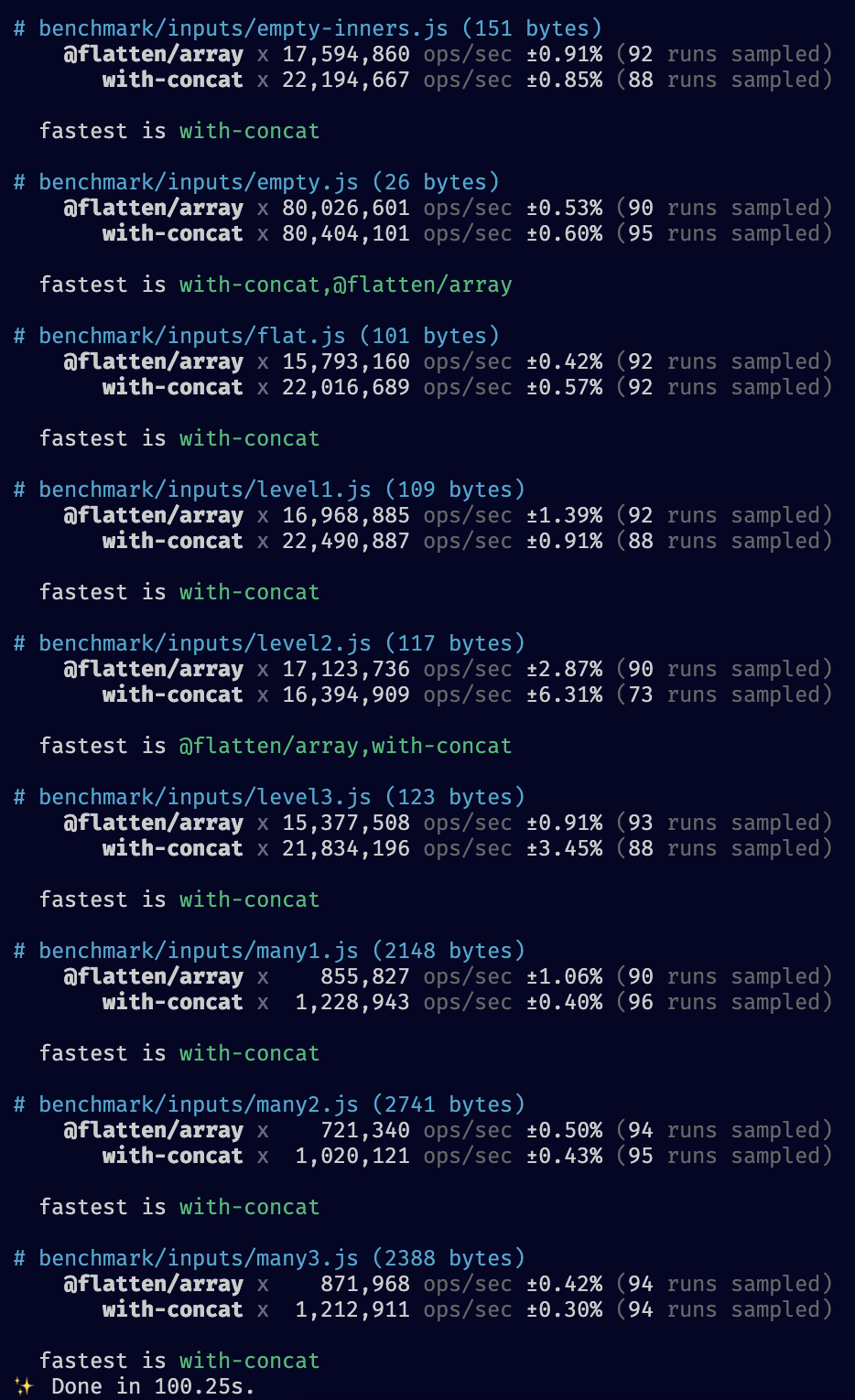 Array.prototype.concatto create a new array with the additional args needed, instead of mutating the value being flattened twice withunshiftandsplice.Results: