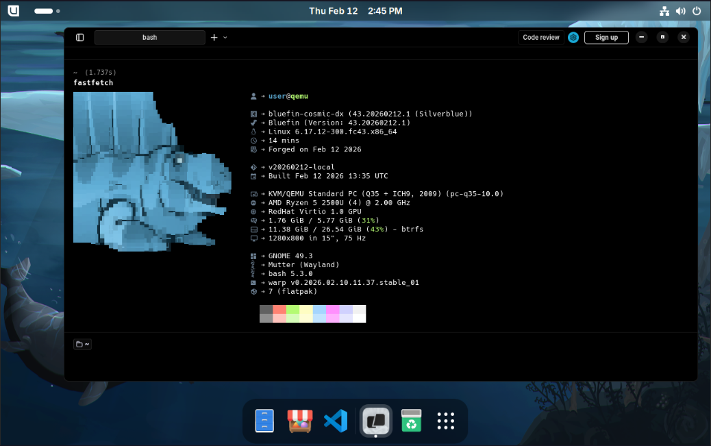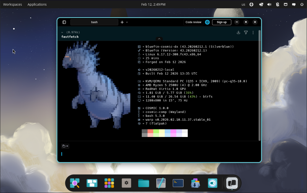 - Fastfetch: Custom config showing image name/version, COSMIC version, and build date (overrides upstream Bluefin config)
