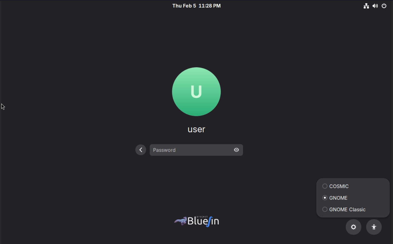 bluefin-cosmic-dx is a developer-focused Bluefin image with GNOME + COSMIC dual desktop support. You can choose which desktop environment to use at the login screen.