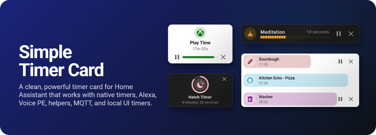 A clean, powerful timer card for Home Assistant that works seamlessly with native timers, Alexa, Voice PE, helpers, MQTT, and local UI timers.