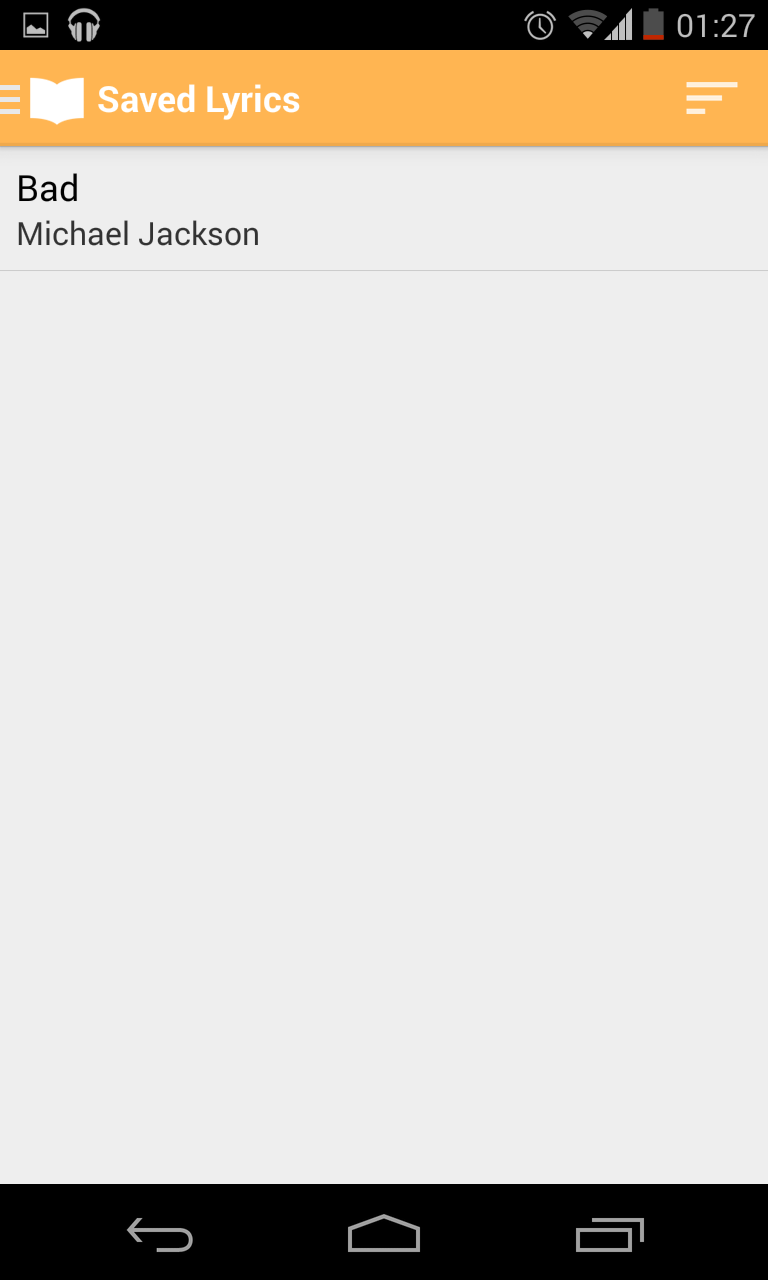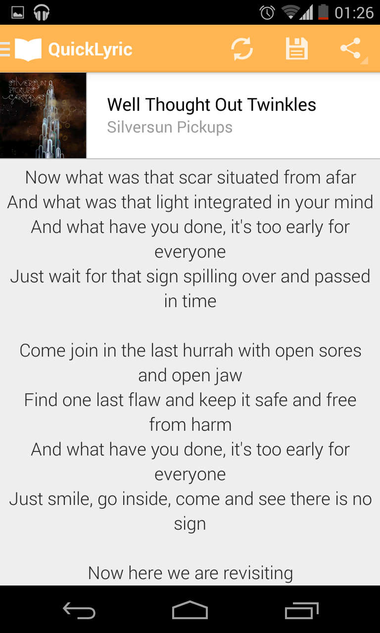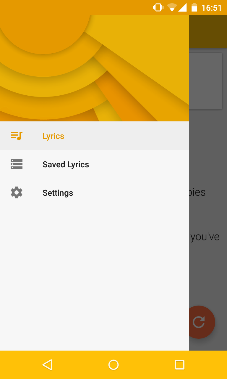 - Lyrics - Shows the lyrics of the song you are listening to at the moment. The Refresh button allows your to update the lyrics when the next song has started playing. In the action bar, you can to download the lyrics on your device (for offline usage), search and share the URL with a friend.