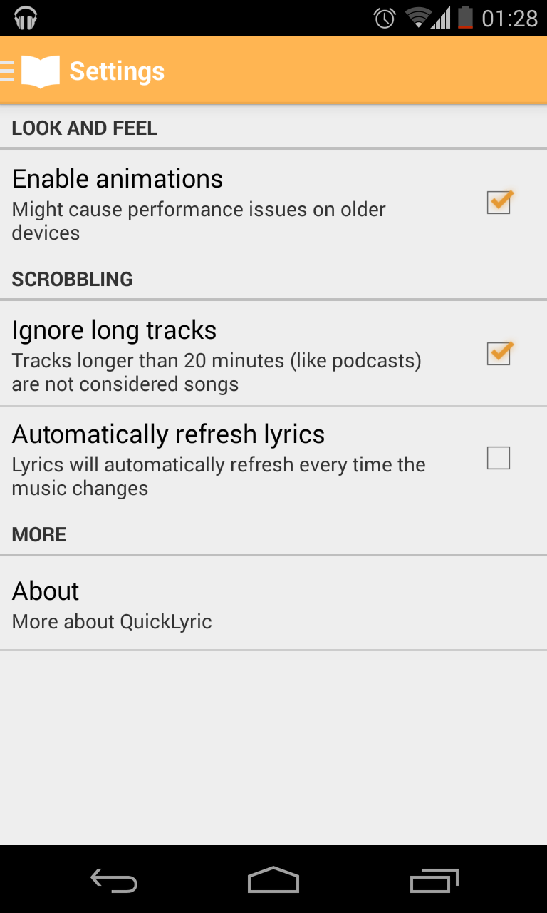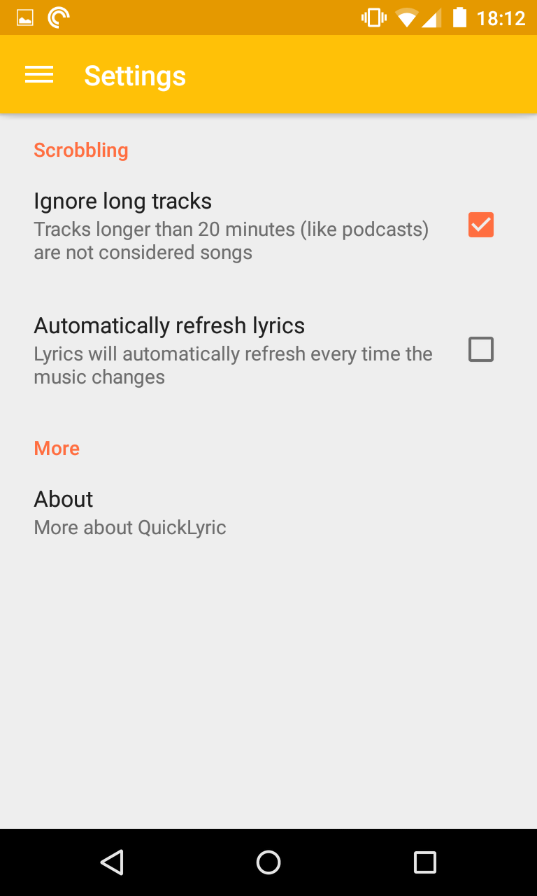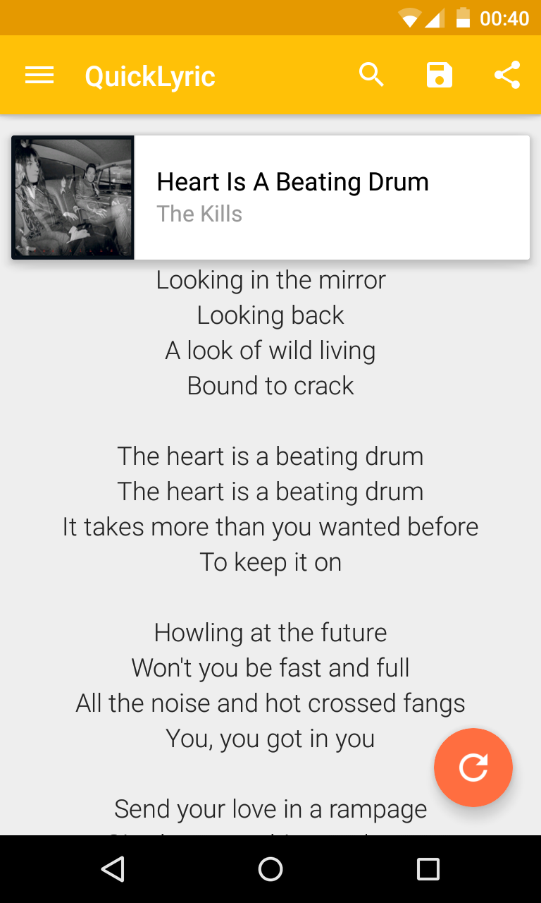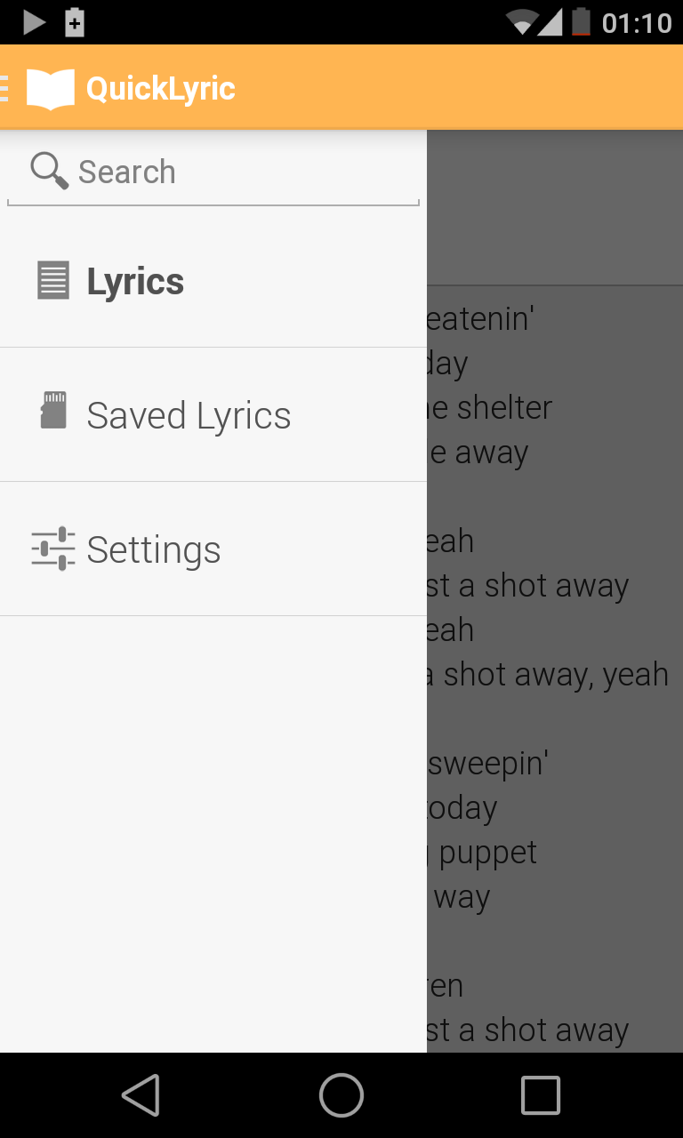 QuickLyric is an android app that fetches your lyrics for you almost instantly. Its main perks is that it's very fast, doesn't have ads, features a search engine, the downloading of lyrics on your device and some handy settings. While most lyrics app require you to type the name of the song you're searching for or annoy you with tedious notifications every time the song has changed, QuickLyric automatically detects what song is playing on your device and instantly delivers the lyrics to you. QuickLyric makes use of Google's Material Design.