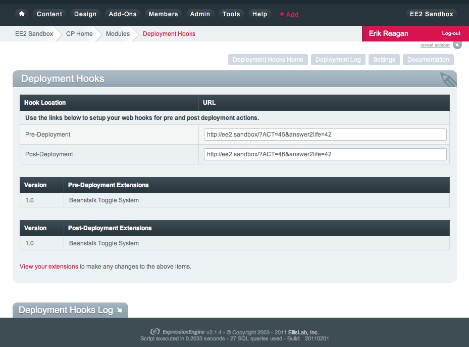 Optionally install the Beanstalk Toggle System add-on included in the package for a sample use of Deployment Hooks