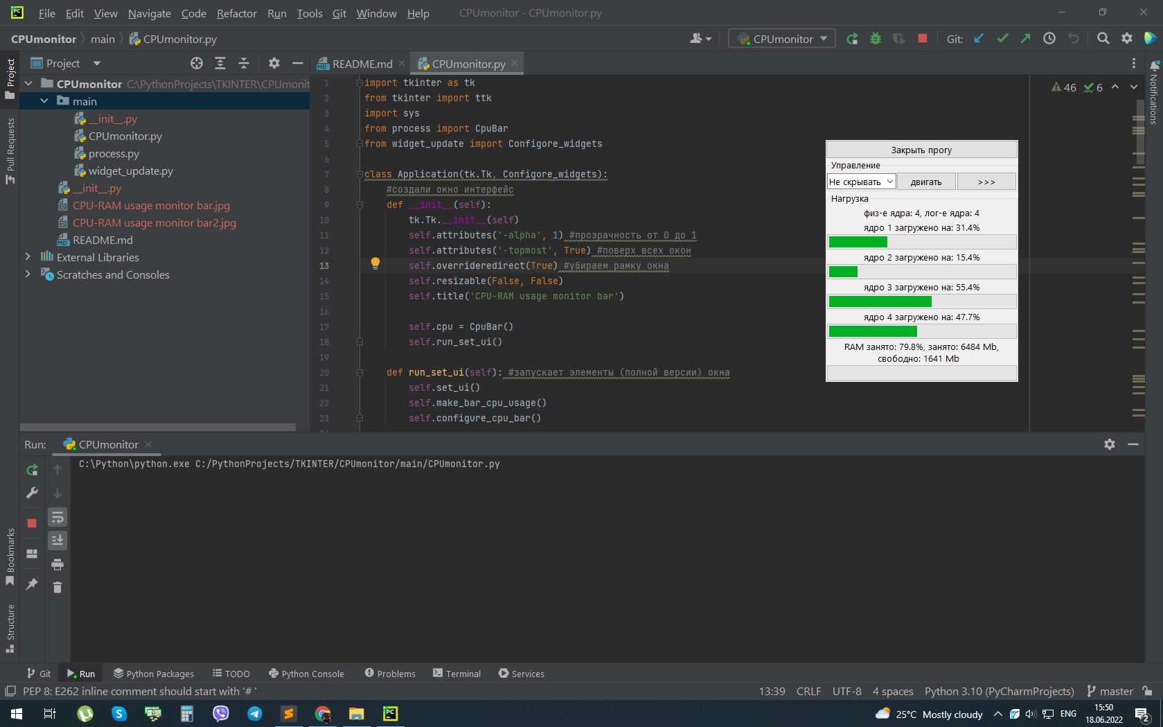 CPUmonitor ⚙ Useful CPU monitor bar Для работы программы нужна библиотека psutil Minimalistic View: Screenshot: