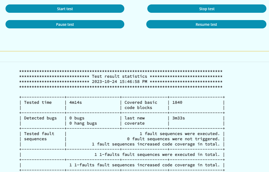 page, enter the path of FaultFuzz test controller jar file (FaultFuzz-ctrl-0.0.1-SNAPSHOT.jar) and the path of the configuration file (FaultFuzz-backend-configuration.properties). When the user clicks the Start test button, FaultFuzz will automatically perform fault injection testing for SUT. Users can also pause, resume or stop the test by clicking the corresponding buttons.