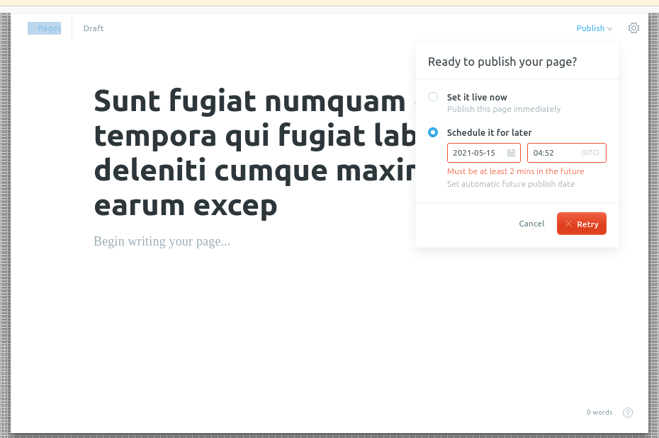 El escenario 22 "Create page and Scheduled" error al ingresar fechas anteriores a la actual
