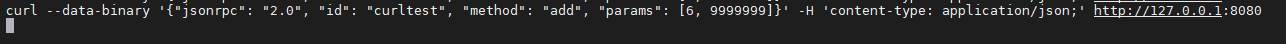 curl --data-binary '{"jsonrpc": "2.0", "id": "curltest", "method": "add", "params": [6, 9999999]}' -H 'content-type: application/json;' http://127.0.0.1:8080