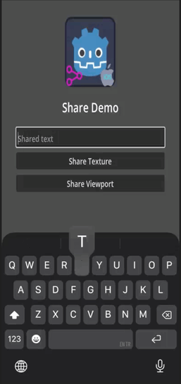 share_text(a_title: String, a_subject: String, a_content: String)- Shares plain text.share_image(a_path: String, a_title: String, a_subject: String, a_content: String)- Shares text along with an image located at the given file path.share_texture(a_texture: Texture2D, a_title: String, a_subject: String, a_content: String)- Shares text with an image generated from aTexture2D.share_viewport(a_viewport: Viewport, a_title: String, a_subject: String, a_content: String, a_flip_y: bool)- Shares text with an image captured from aViewport.share_file(a_path: String, a_mime_type: String, a_title: String, a_subject: String, a_content: String- Shares text along with a file at the specified path and MIME type.