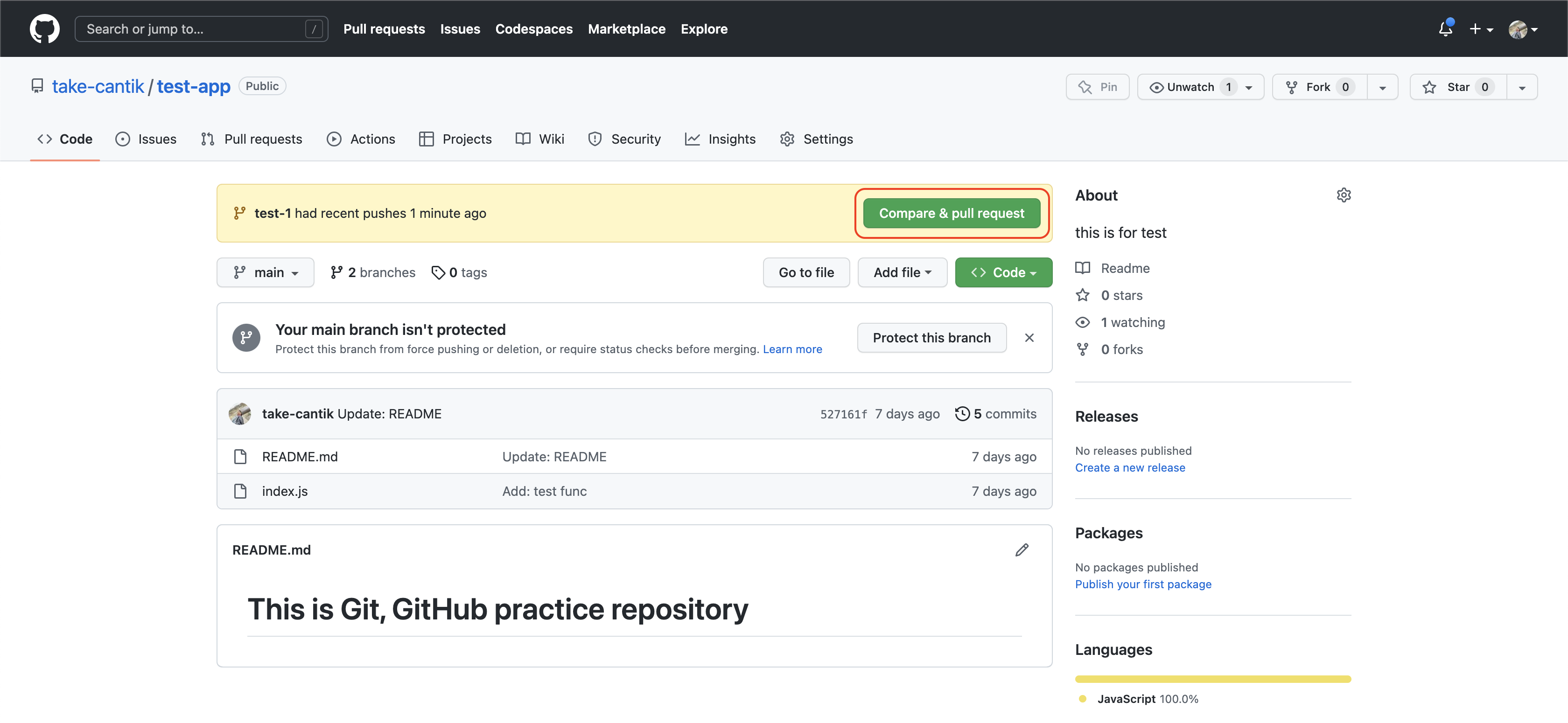 $ git push origin [ブランチ名]push 後「Compare & pull request」を選択