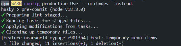 ## 문제 절차 1. `git add` 2. `git commit` ## 현재 상황 `git commit`시 아래 경고 문구 출력됩니다. `Warning: React version not specified in eslint-plugin-react settings.`  ## 예상 결과 아래 처럼 `commit`시 에러없이 `eslint` 검사 통과