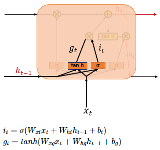 g : 현재 시점 t의 x값과 입력게이트로 이어지는 가중치 Wxg를 곱한 값과 이전 시점 t - 1의 은닉 상태가 입력 게이트로 이어지는 가중치 Whg를 곱한 값을 더해서 tanh 함수를 지남