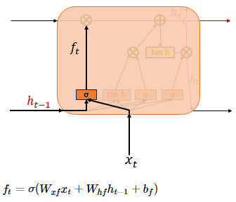 현재 시점 t의 x값과 이전 시점 t-1의 은닉 상태가 시그모이드 함수를 거쳐 0 ~ 1 값이 나오게 되고, 이 값이 곧 삭제 과정을 거친 정보의 양 (0에 가까울수록 정보가 많이 삭제된 것이고 1에 가까울수록 정보를 온전히 기억한 것)