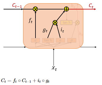 입력 게이트에서 선택된 기억(새로운 정보)을 삭제 게이트의 결과와 더함 (Ct - 현재 시점 t의 셀 상태, 다음 t + 1 시점의 LSTM 셀로 넘겨줌)