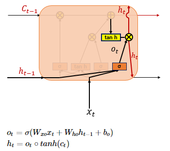ot - 출력 게이트는 현재 시점 t의 x값과 이전 시점 t - 1의 은닉 상태가 시그모이드 함수값을 지난 값 (현재 시점 t의 은닉 상태를 결정하는데 사용)