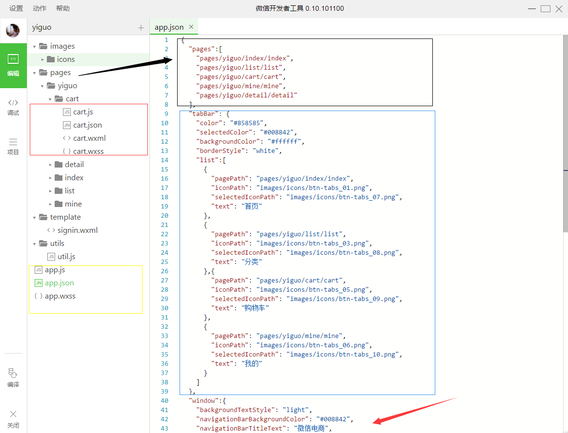 第一部分(黑色框)是pages是整个里的页面,每添加页面一个页面,都要把路径写在这里: