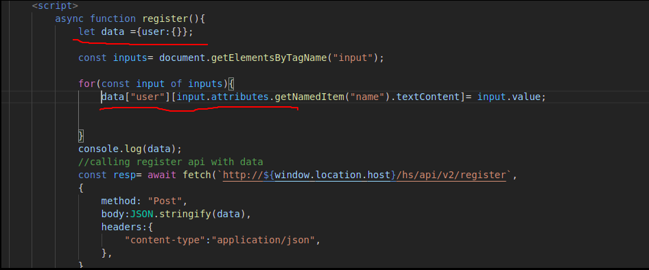 In [docs](https://docs.hypersign.id/developer/sdk/dev-nodejs/client-side/registration-page) code for creating registration page generates error. Error:-  If we write the code as below error will be resolved:-