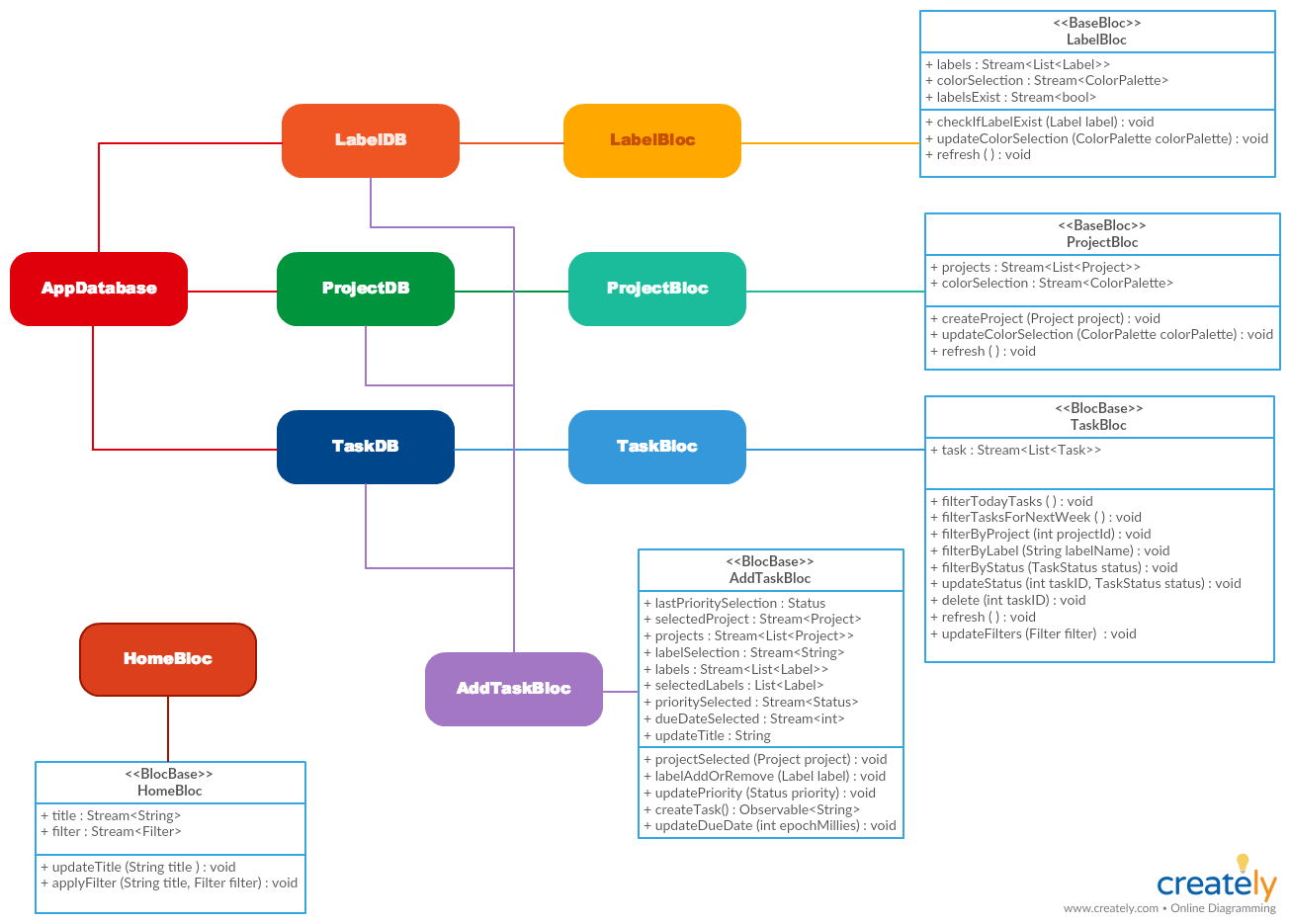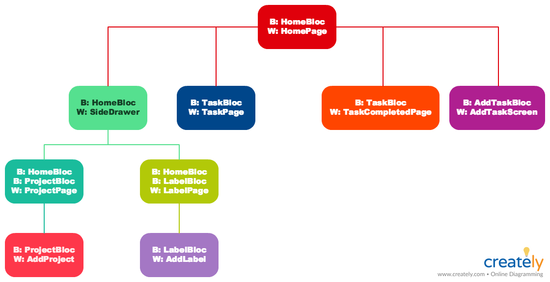 This diagram show case the dependencies to create a feature specific BLoCs.The HomeBloc is independent and used as communication channel between its child widgets.