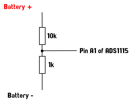 Note that you can also use the analog pins of the arduino directly to measure voltage, but the resolution is only 10 bit (0-1023) which is not so good. For example a 3S lipo going from full charge (12.6v) to low charge (say 10.6v) is 2v change, so a 10:1 voltage divider sees 0.2v change, or 0.2/5 of the 0-1023 range which is only about 40 discrete steps, ie. a resolution of about 0.05v per step. Acceptable I suppose, but the situation is worse for the current sensor which deals in smaller ranges. If you only want to measure voltage, using a simple analogRead would probably be fine, but if you want to measure current and you have a ADS1115 you might as well also use it to measure the voltage, so the 16-bit ADC will give a voltage resolution of around 0.0008v.