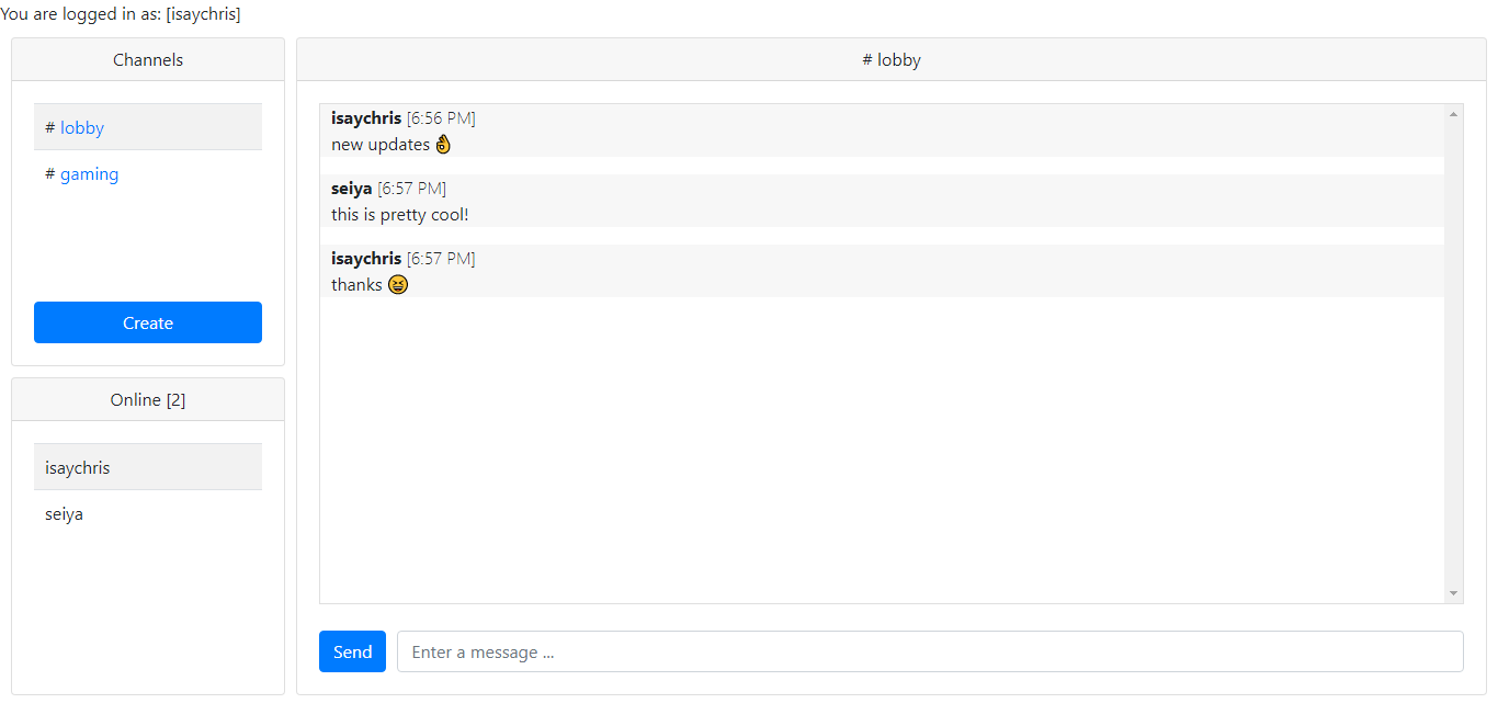 Channel selectionLimit number of messages for each channel to 100Load saved messages from serverPress enter to submit messagesFix layout- Check for naming duplicates