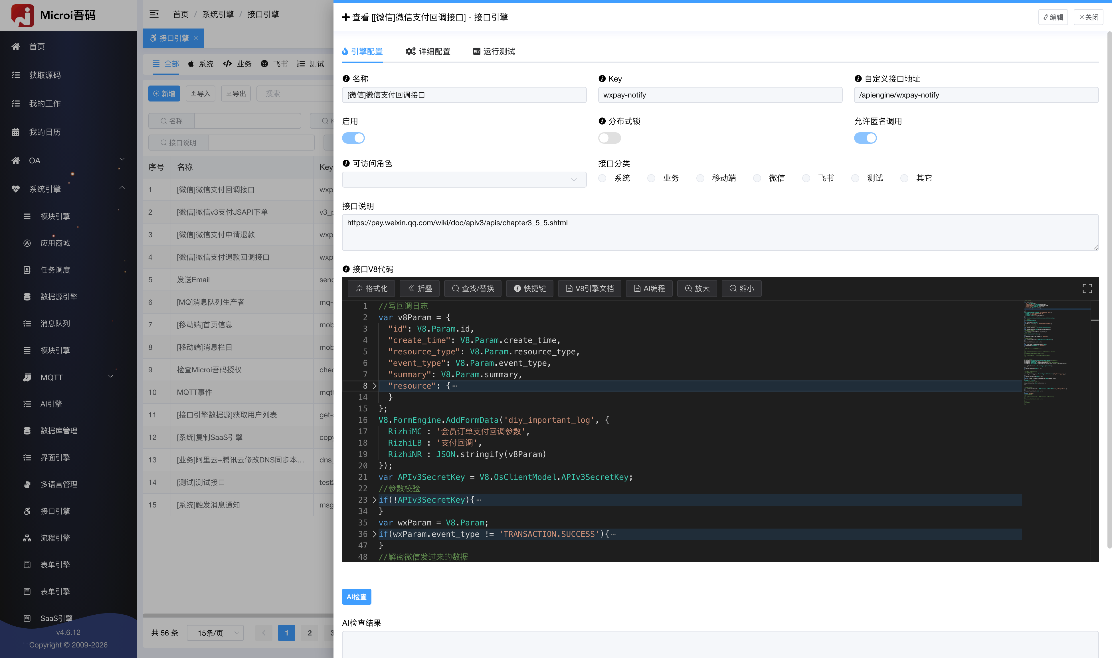 JavaScript编写后端api接口,支持 [AI代写V8引擎代码],支持[Get、Post]请求,支持返回[JSON、字符串、文件、HTML]等,支持[自定义接口地址、分布式锁、权限、自定义扩展函数]等。可实现任意复杂的业务场景。极致的性能与开发效率,无需编译发布,保存即生效- WebOS试用地址:https://webos.microi.net