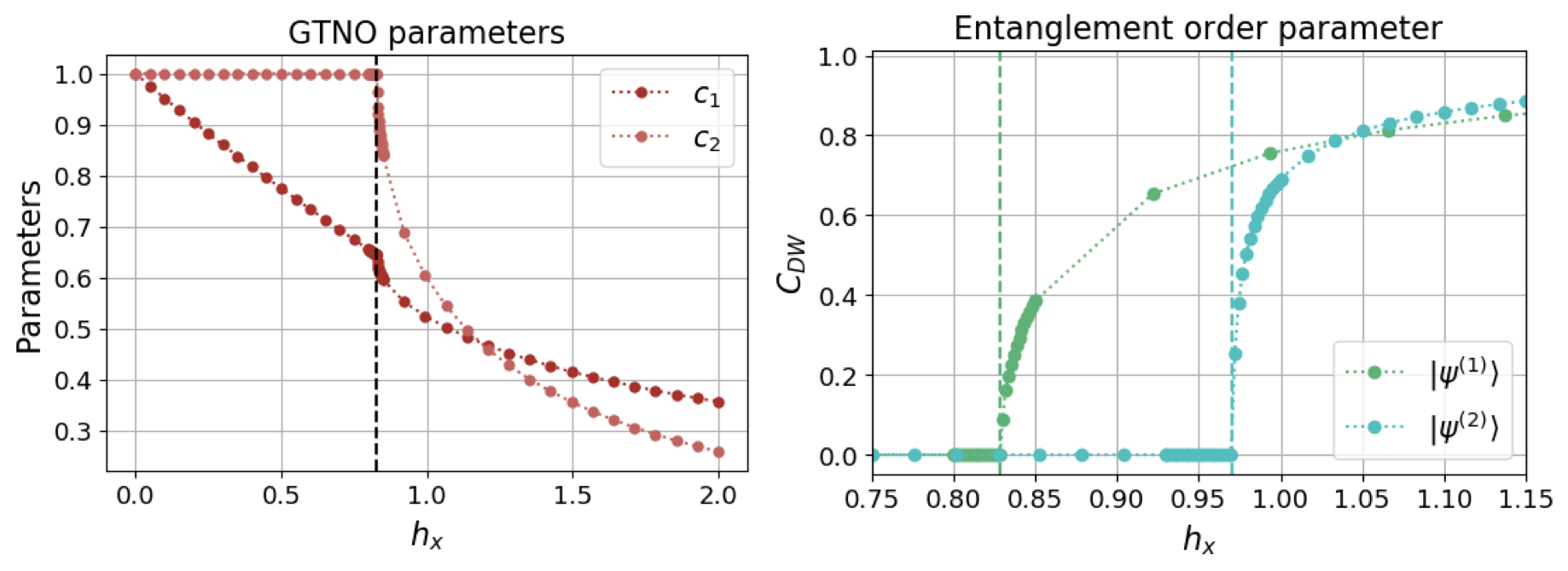 - Phase transition in the 1D traversed field ising model. Using the virtual order parameters and entanglement order parameters, we probe the phase transition between the polarized and spontaneously symmetry-broken phases using GTNO.