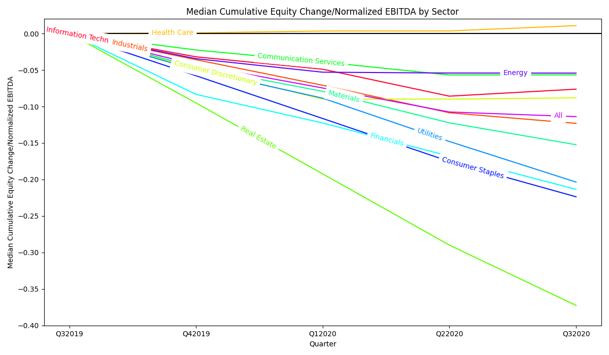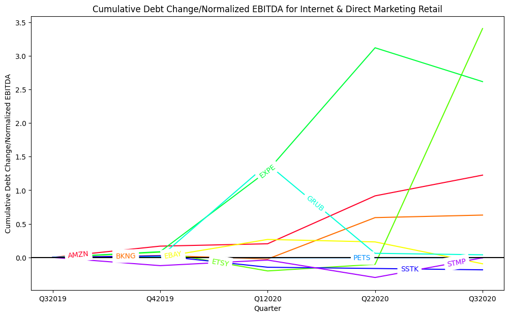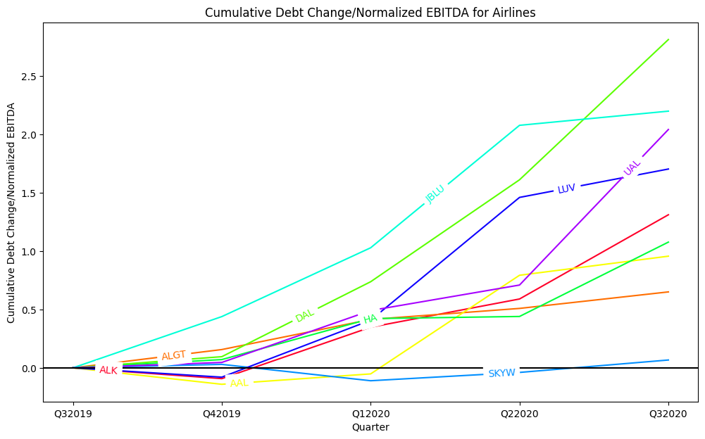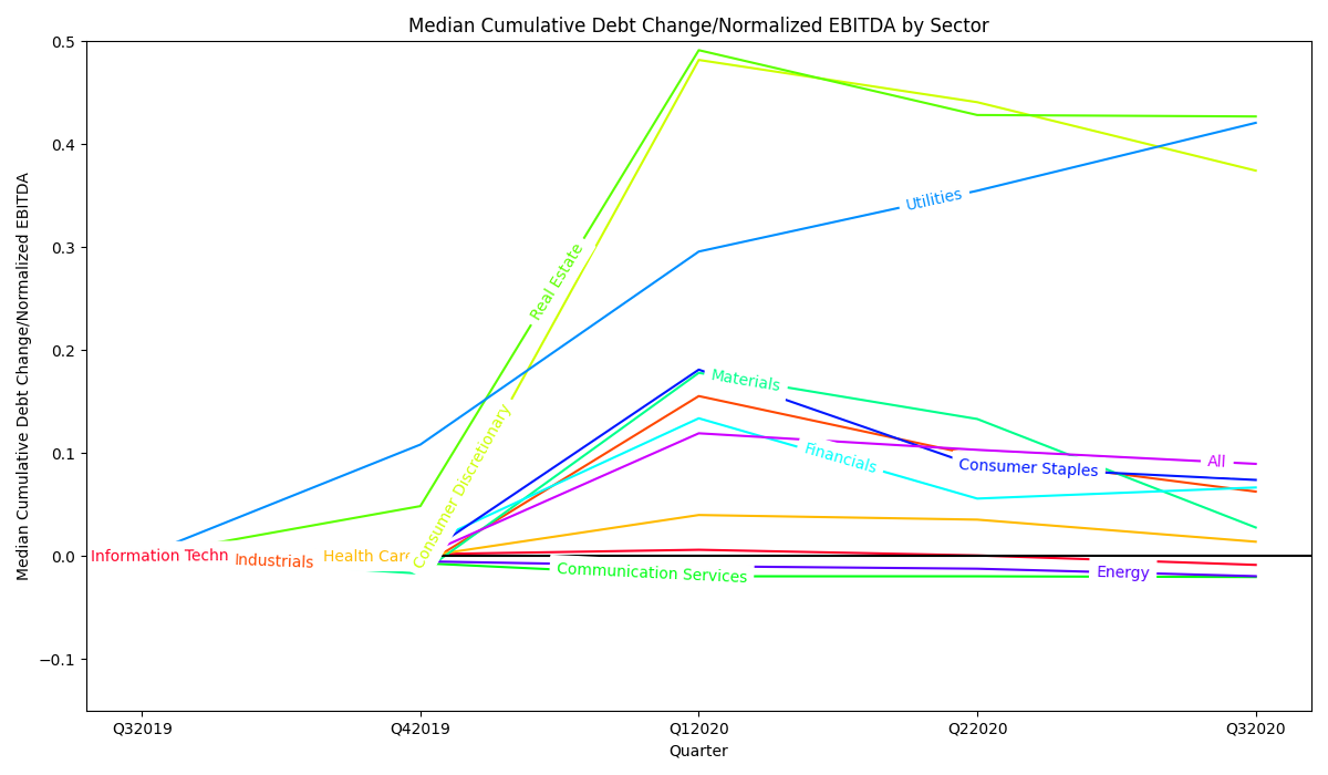 ax.legend()The following is an example of the Python code that uses Matplotlib to generate a line chart showing the cumulative median debt change to normalized EBTIDA for each GICS sector for each quarter in study. Similar code was used for other line charts in this report.