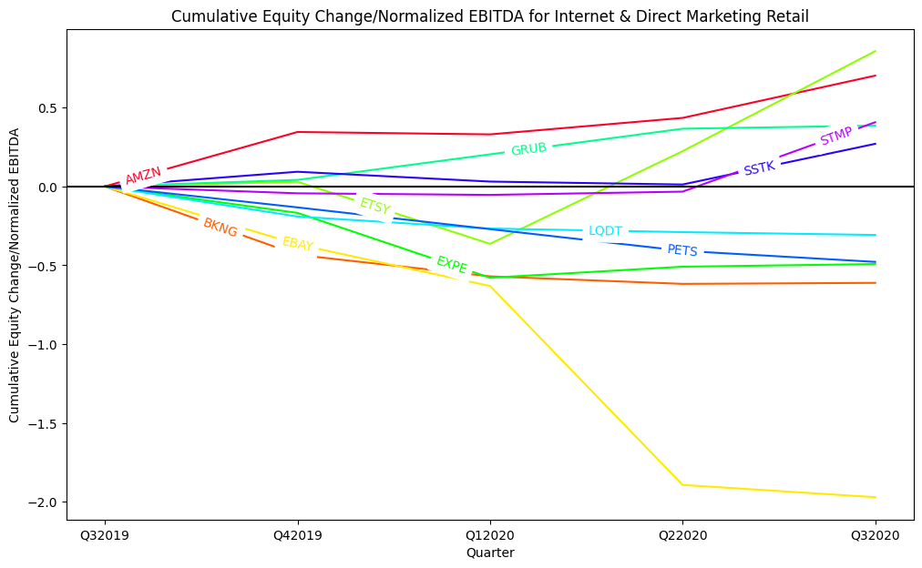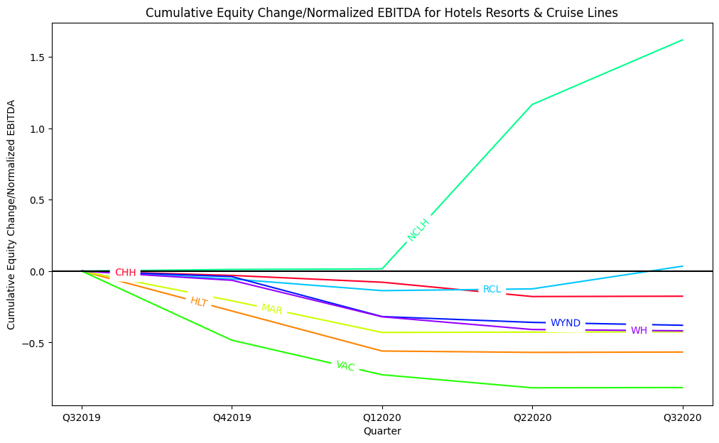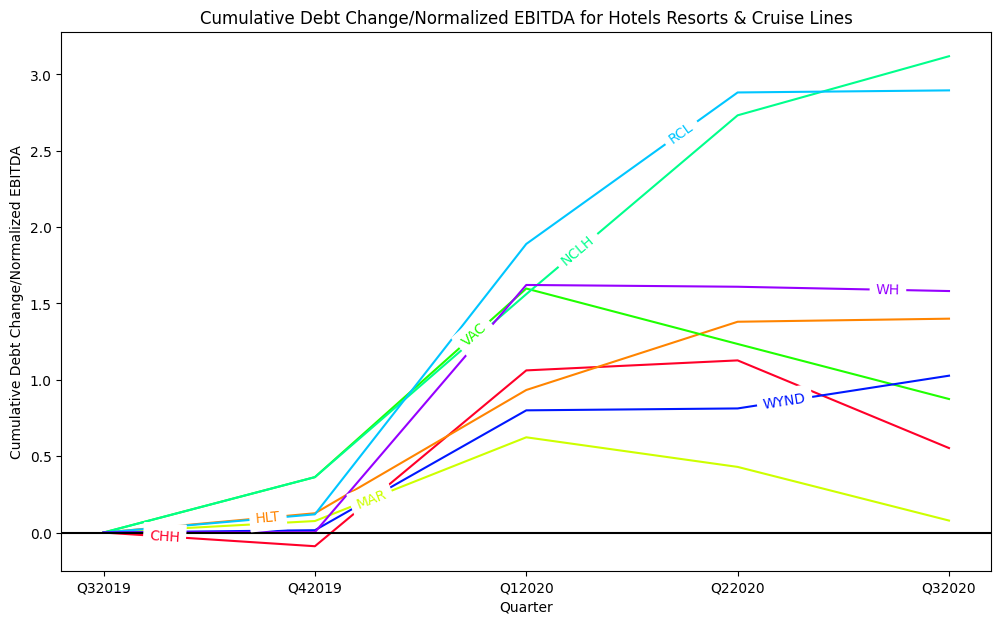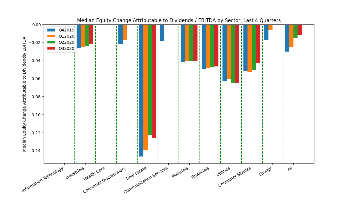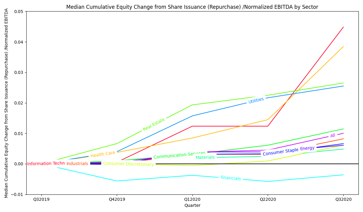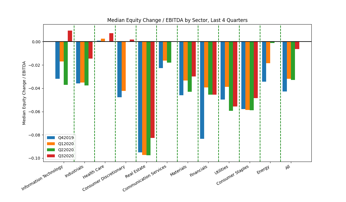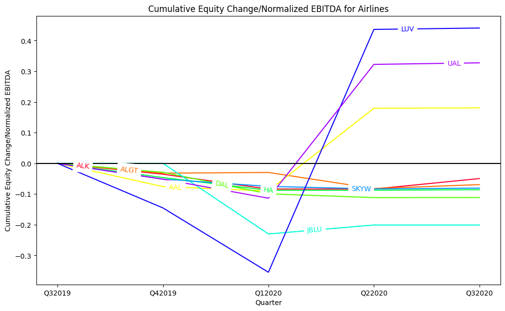 I computed a normalized EBITDA using 2015-2019 annual EBITDA for each company. I then computed change in total debt each quarter. Next, to represent change in equity value, I calculated an average share price for each company for each quarter in study, and determined the total equity value raised or returned to shareholders as a result of: