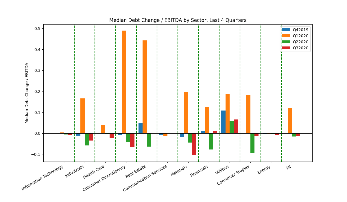 WHERE gics.sector = industrialsThe following is an example of the Python code that uses Matplotlib to generate a bar chart showing the median debt change to normalized EBTIDA for each GICS sector for each quarter in study. Similar code was used for other bar charts in this report.