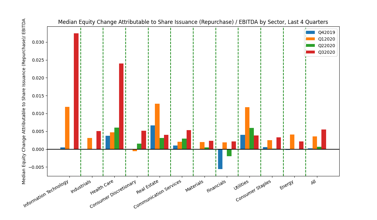 Some notable conclusions can be drawn from the above graphs. First, a lot of firms continued to pay dividends despite the financial strain on the economy as a whole. The median real estate firm paid out approximately 0.13x its annual EBITDA as a dividend at the end of each of the studied quarters. Part of this could be attributable to SEC requirements that real estate investment trusts (REITs) must pay out 90% of their taxable income annually in the form of dividends.2 The amount of equity raised from share issuance trended upwards over the past four quarters. Sectors like information technology and health care both saw sharp increases equity raised by share issuance in Q3 2020. Perhaps the most important takeaway from the above graphs is that the magnitude of capital raised by issuing debt, on average, far exceeded that of capital raised by issuing equity. The median consumer discretionary and real estate firm both issued debt on the order of 0.4-0.5x their annual EBITDA during just Q1 2020. While this could be a sign of financial distress due to COVID, it could also be a result of the incredibly low cost of borrowing.