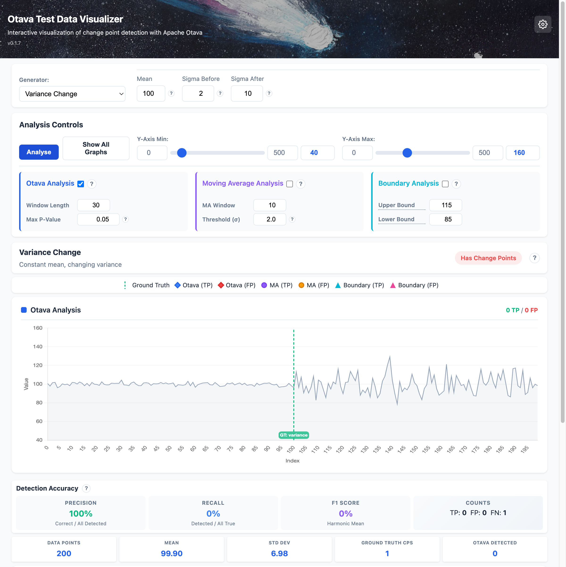 - Compare three analysis methods: Otava (statistical), Moving Average, and Boundary detection
