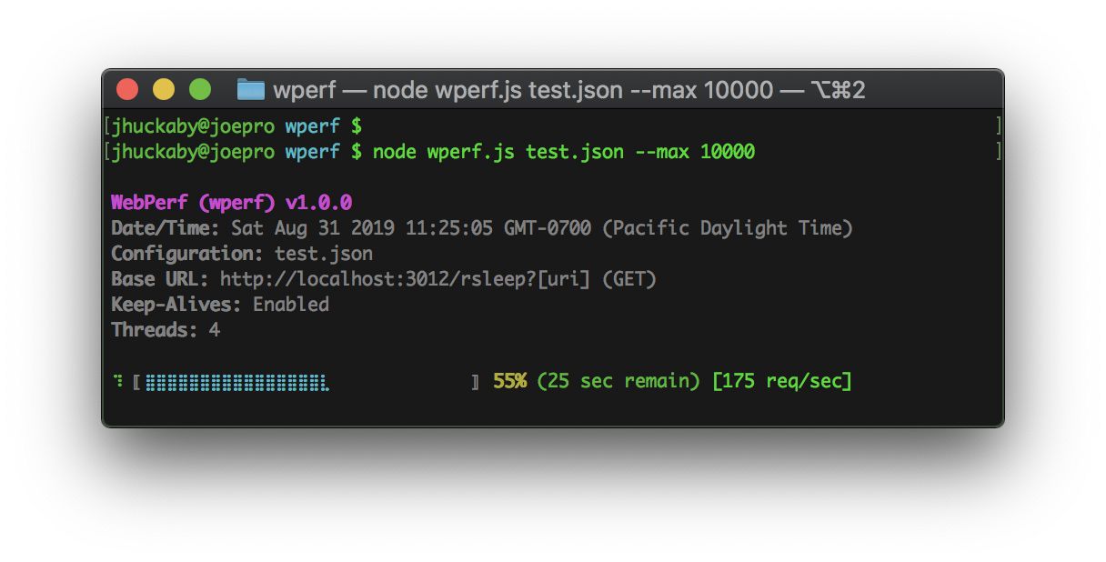 wperf my-load-test.json --verboseYou can specify most configuration options on the command line (using the syntax --key value) or in a JSON configuration file as a top-level property. There are a few exceptions which are noted below.
