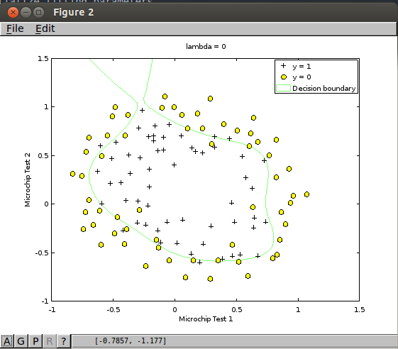 plotDecisionBoundary.m에 의해서 non-linear decision boundary를 그리게 된다.