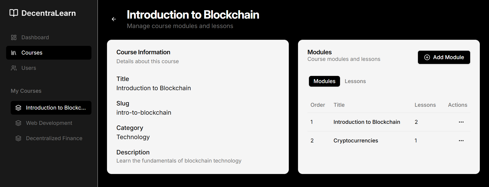 Admin Modules/Lessons Page Displays modules and lessons within a course, with options to manage them. Admin Modules/Lessons Page