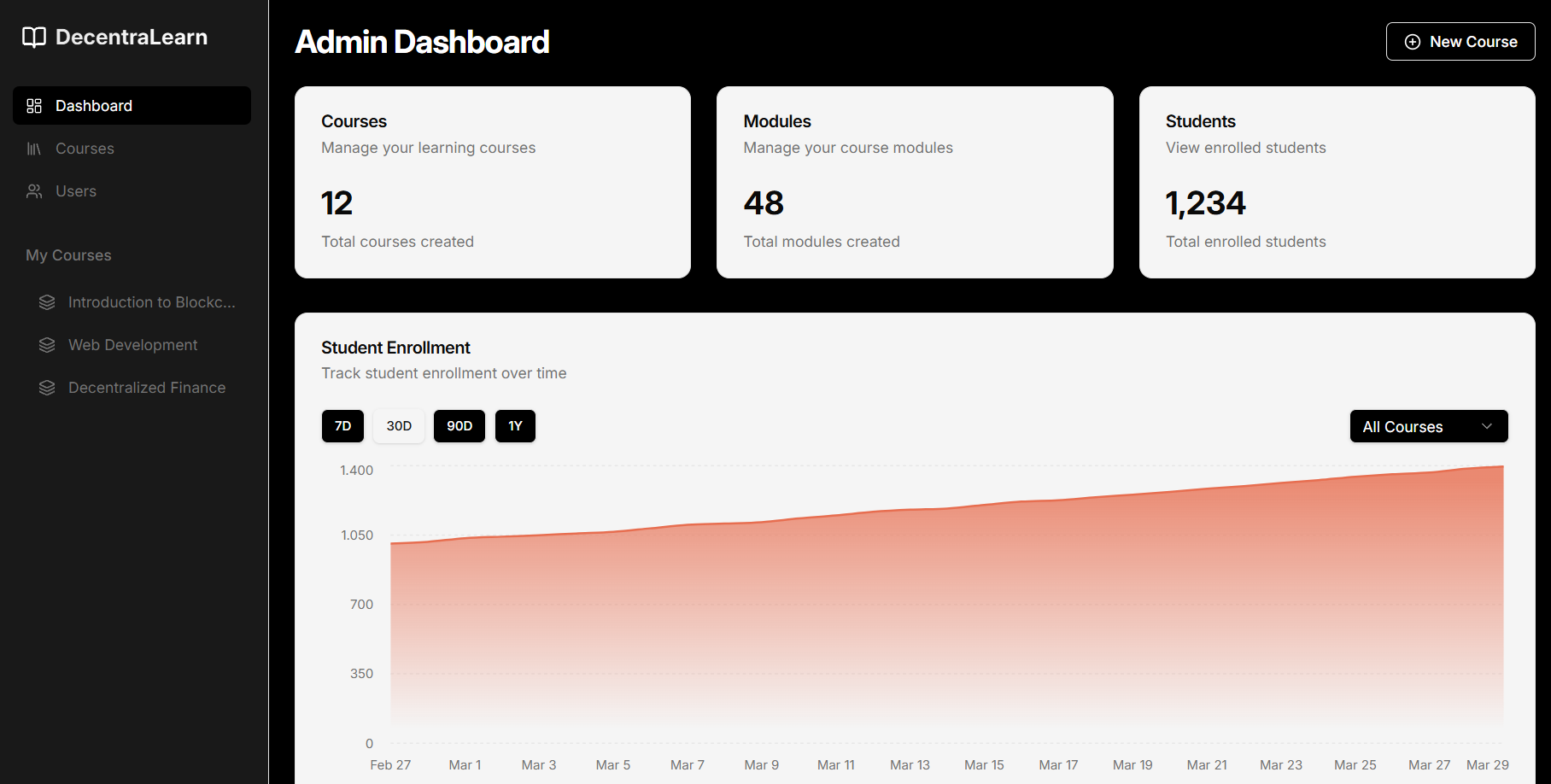 Dashboard Screen Displays an overview of courses, modules, and student progress analytics. Dashboard Screen