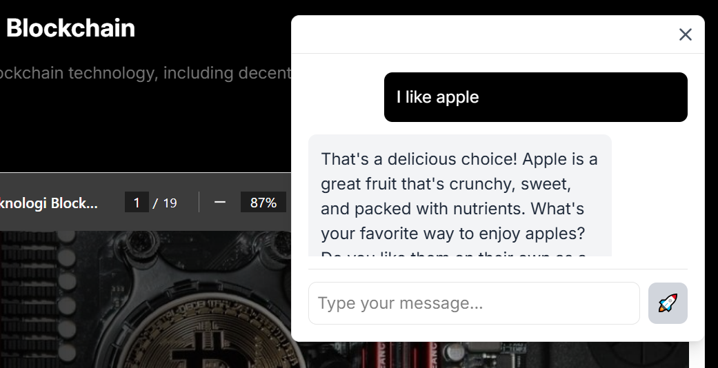 The AI functionality is integrated using the Ollama LLM Canister. It uses the Llama 3.1 model to answer questions and provide helpful responses. The AI exists in chatbot form, where users can ask questions on a variety of topics. Below is a picture of the AI functionality in action: